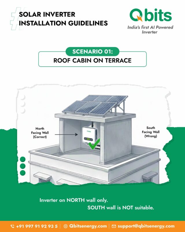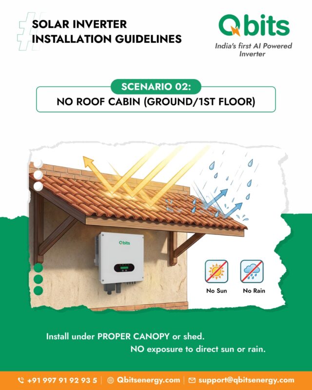 Inverters should never be installed under direct sun exposure. Heat reduces inverter efficiency and shortens lifespan. Use natural shade, inverter sheds, or protective covers.